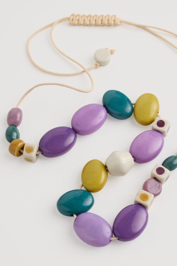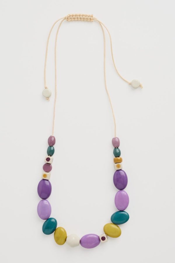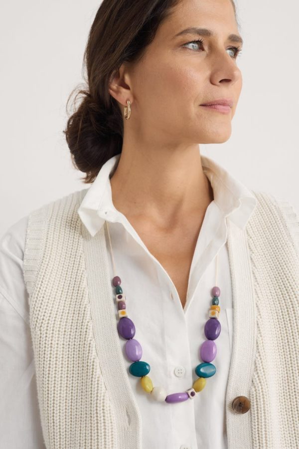 Richly coloured resin and ceramic beads on an adjustable cotton cord, with smooth and pebble textures inspired by the Cornish coast. We love this style over our favourite Sailor Shirt, tunics, and shirts – anything and everything!