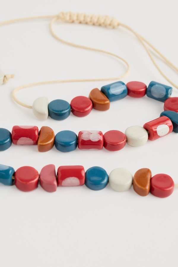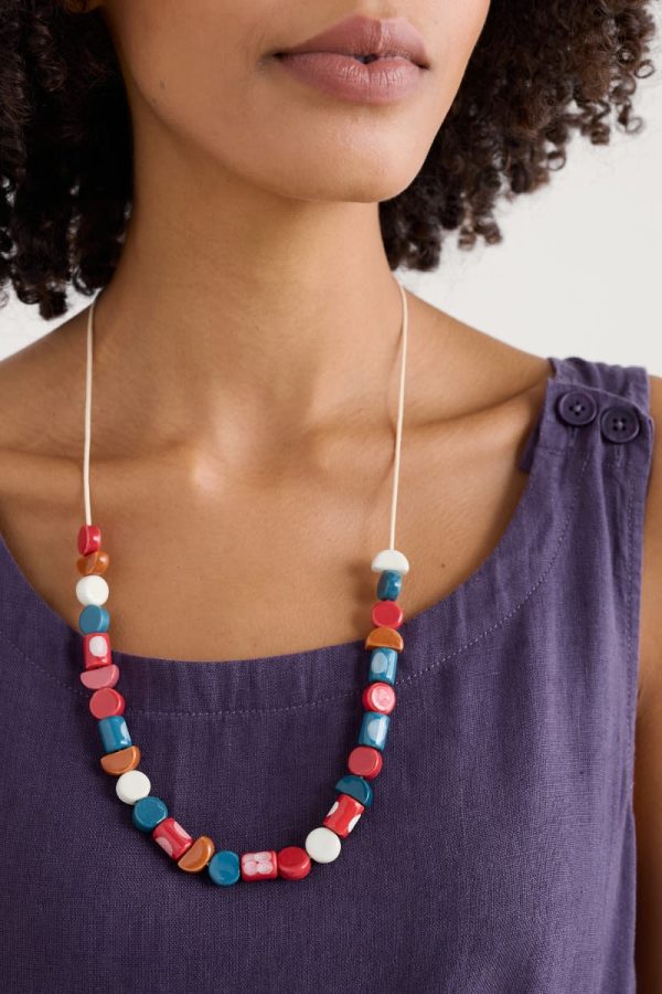 A pattern of colourful beads, with floral stamps, round and semi-circular shapes. Adjust the cotton cord to find your perfect length. The perfect partner to our Collan Earrings, we also love this style layered over Sailor Stripes that pick out one of the rich colours.