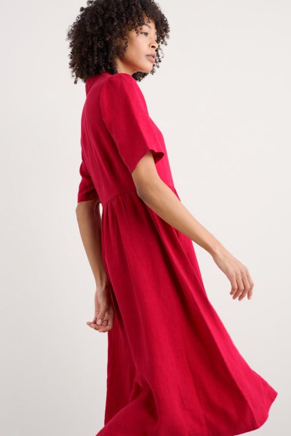 A vintage-inspired midi dress, made from cool and breathable linen. Its classic waisted silhouette is enhanced by the midi-length skirt, constructed from six panels for fullness and sway. The bodice features bust darts for subtle shaping, and we’ve finished it with a distinctive nautical-style V-necked collar. A signature piece for the summer.