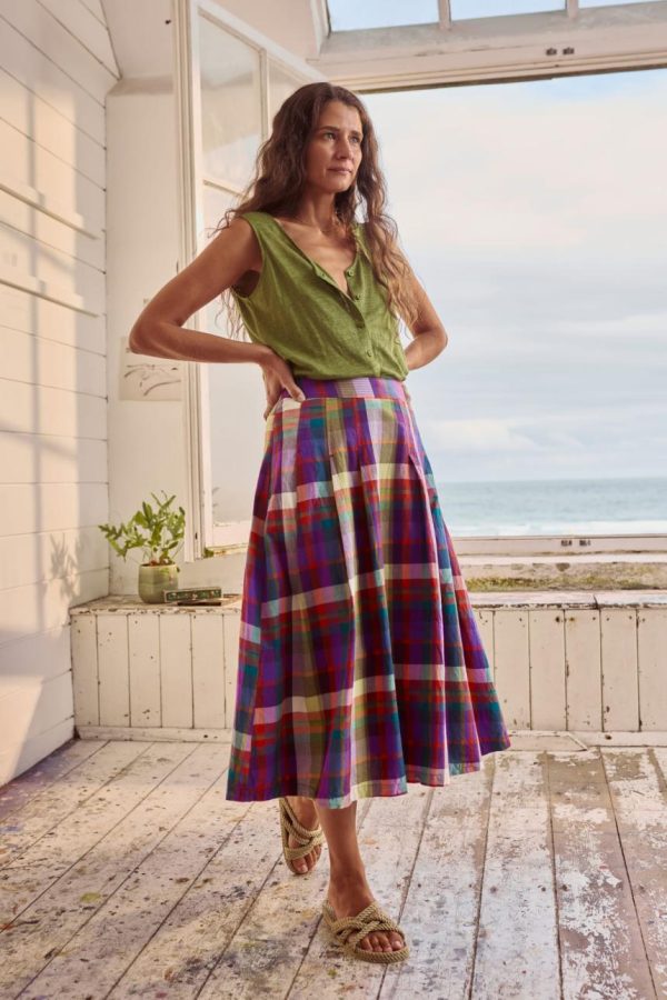 Woven from soft cotton chambray, our Jamboree Skirt feels silky and cool against the skin. We’ve given this midi length style soft pleats for plenty of movement, so it’s full and floaty with a flattering waistband and concealed side zip. It’s finished with a delicate seaweed print that adds an extra special touch. We like it best with a simple organic cotton top.