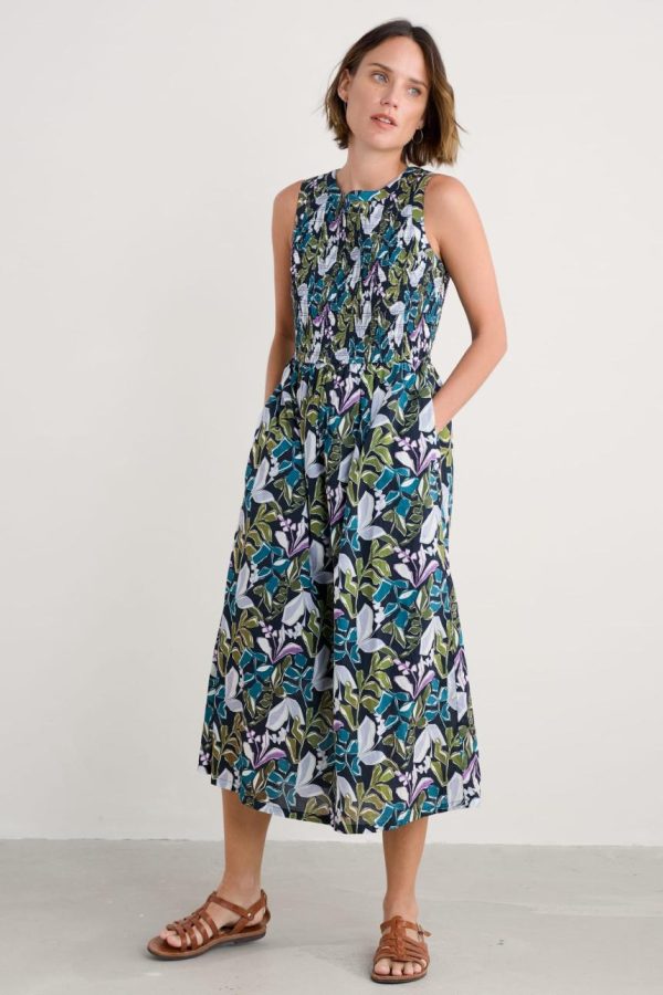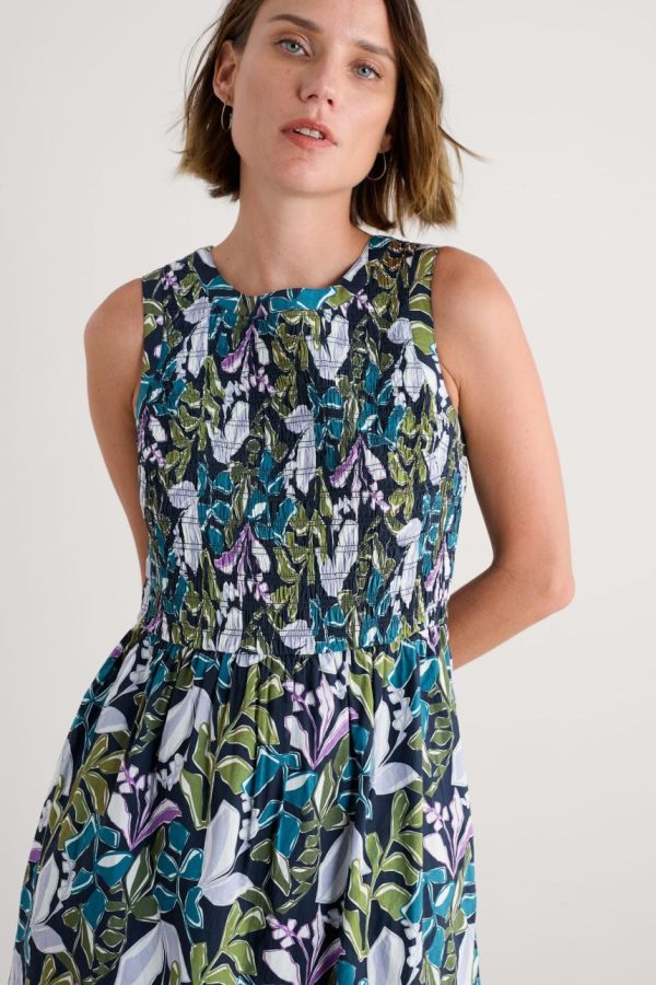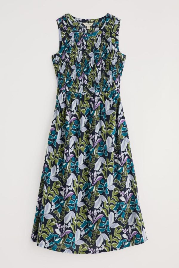 A traditional smocked bodice gives the Meadowsweet a flattering waisted shape. Crafted from pure organic cotton, the sleeveless dress is cool and airy for warmer days, with a full skirt that falls above the ankle. A pair of side pockets adds the finishing touch. Wear with sandals and a sunhat for sub-baked summer days.