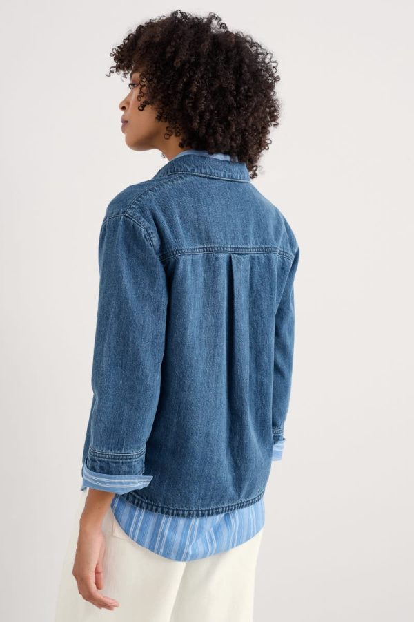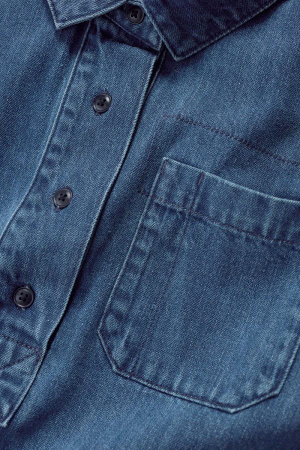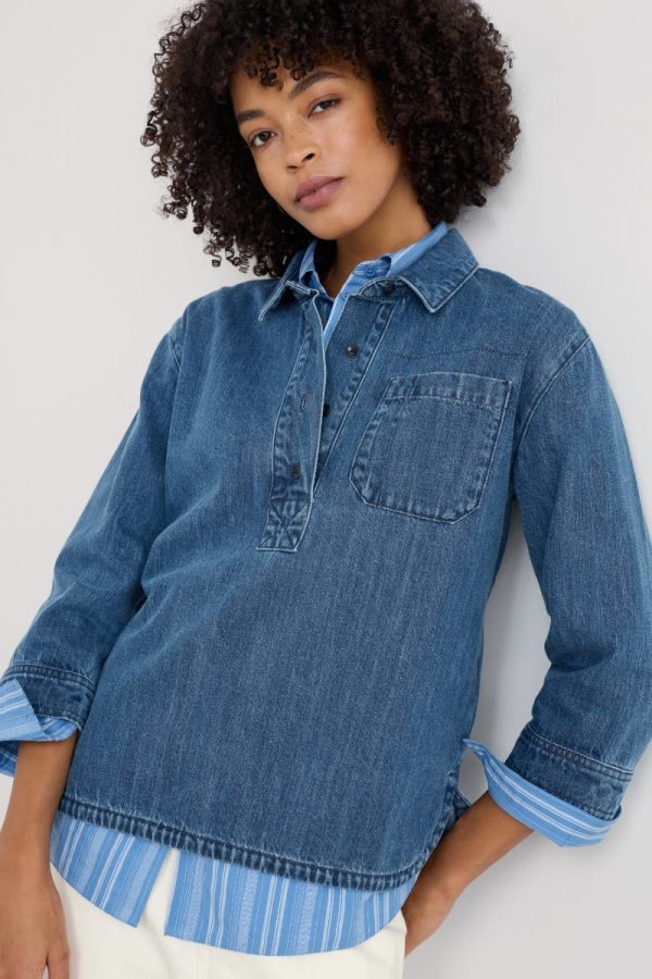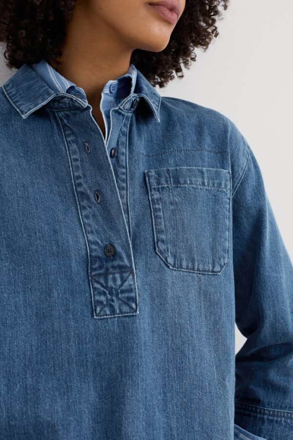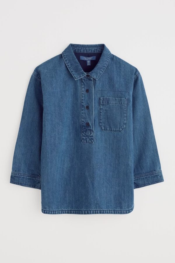 The classic casual shirt is back, with an authentic denim washed finish. Time-honoured details include a collar, chest pocket and buttoned half-placket, with laid-back three-quarter sleeves. The curved hem and relaxed fit make are perfect for wearing over your waistband.