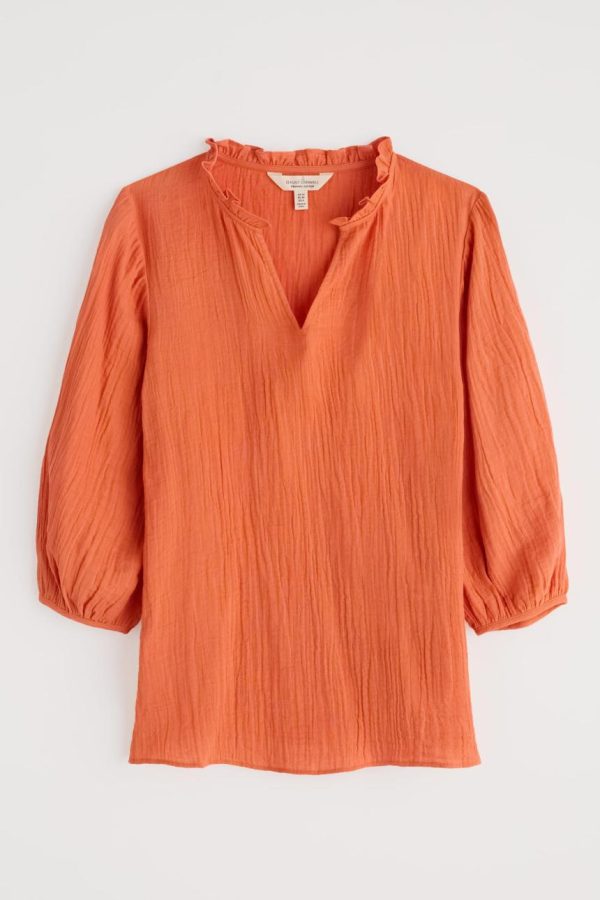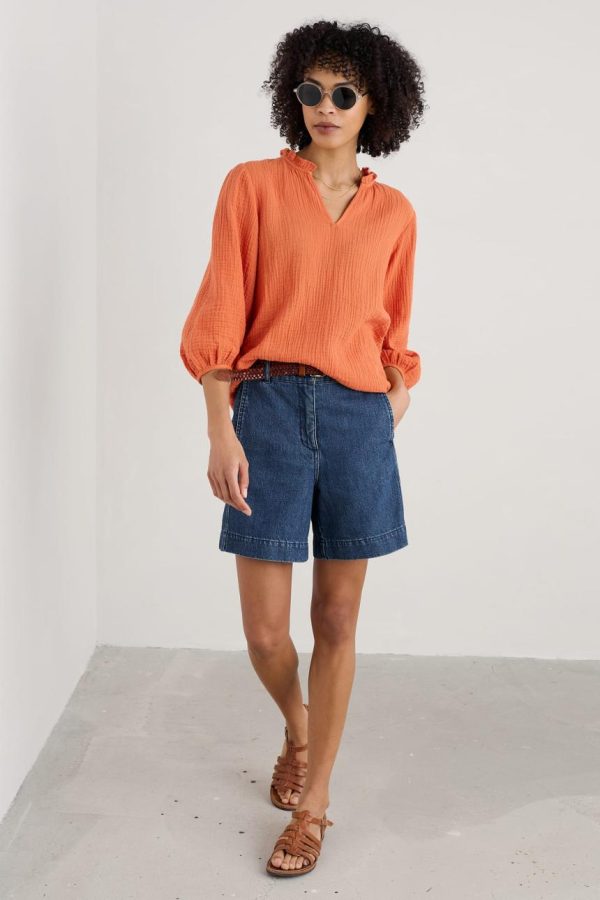 With an easy fit and gently full 3/4 sleeves, the Portrait Top is made for relaxed summer days. It’s crafted from woven GOTS-certified organic cotton, and we’ve used double cotton gauze for a lovely drape and texture. The high frilled collar dips down into a notch neckline detail, creating a pretty focal point.