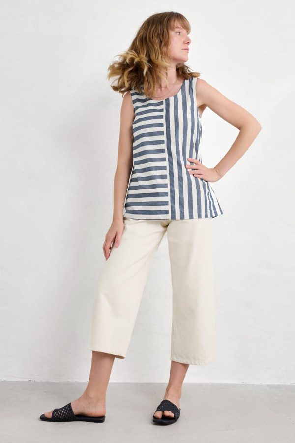 Embrace vertical and horizontal stripes in this bold and cheerful vest, made from soft organic cotton. The sleeveless top has a relaxed swing fit with bust darts for subtle shaping. Its round neckline curves into a keyhole detail at the back with a single button fastening. Those signature stripes are yarn-dyed for a deep and lasting colour.