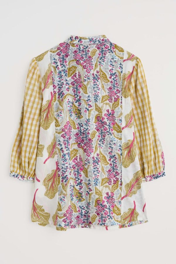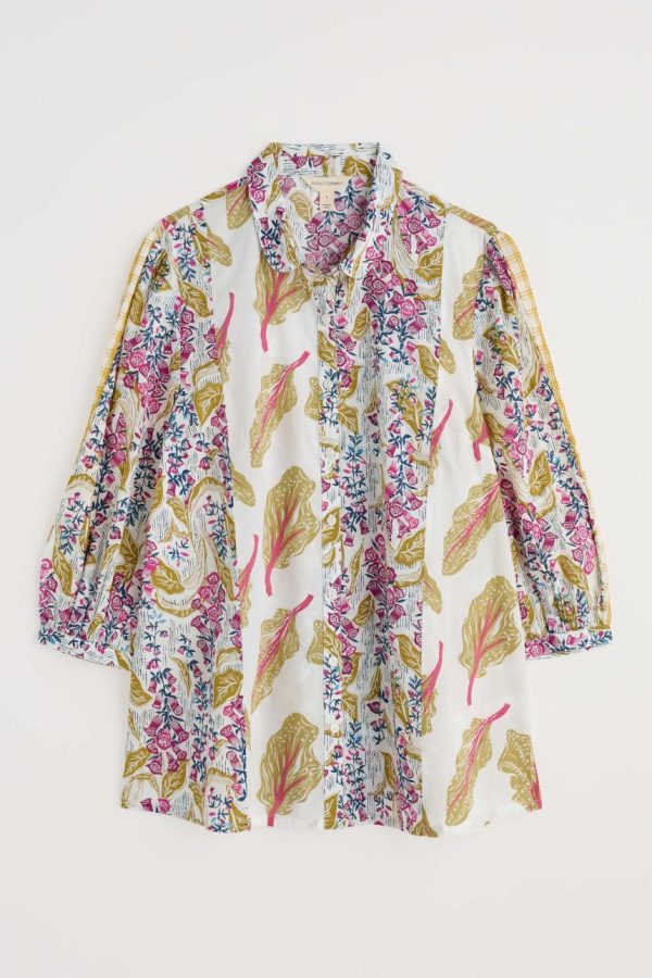 The Hope Cottage Blouse has an easy fit and a gently flared shape, with soft blouson sleeves. Its neat Peter Pan collar, slim cuffs and button-through front add classic details. Each blouse features its own individual pattern of colours and prints. A uniquely creative piece, that changes the way excess fabric is treated.
