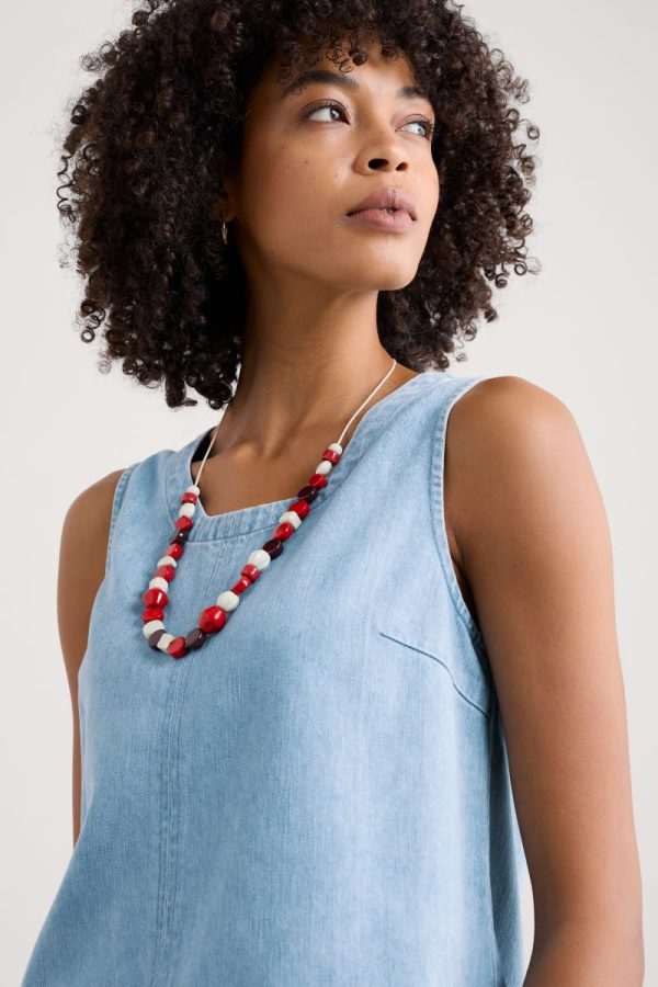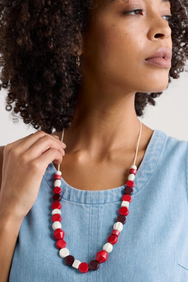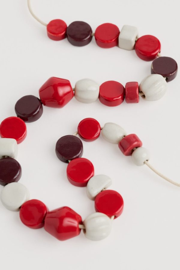 Complete your outfit with a splash of colour. Our Serravezza necklace features a blend of ceramic beads in rich colours and organic shapes. The mixed beads are threaded onto a cotton cord, which can be adjusted to your favourite length. The cord is finished at the back with a pair of little beads.
