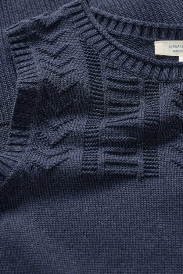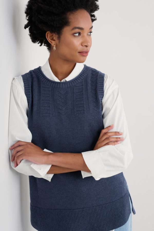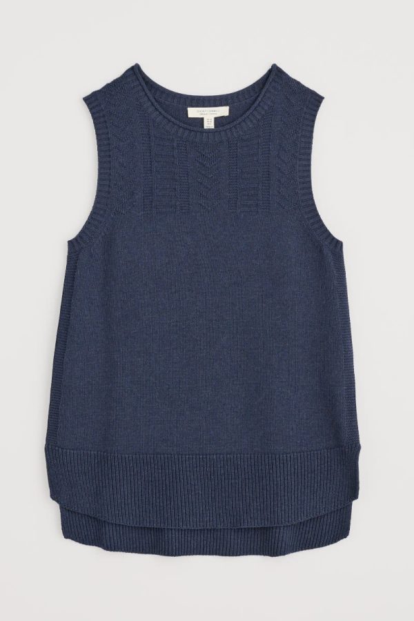 One of our longer knitted vests, made from breathable organic cotton with an easy shape and a split stepped hem that make it perfect for layering. The stitch patterning at the yoke is inspired by traditional Fisherman’s jumpers.