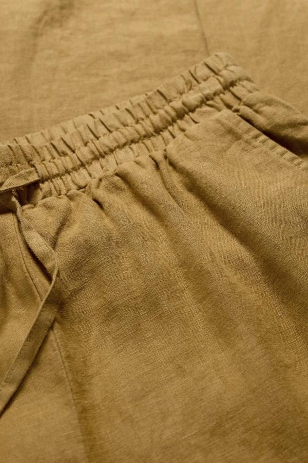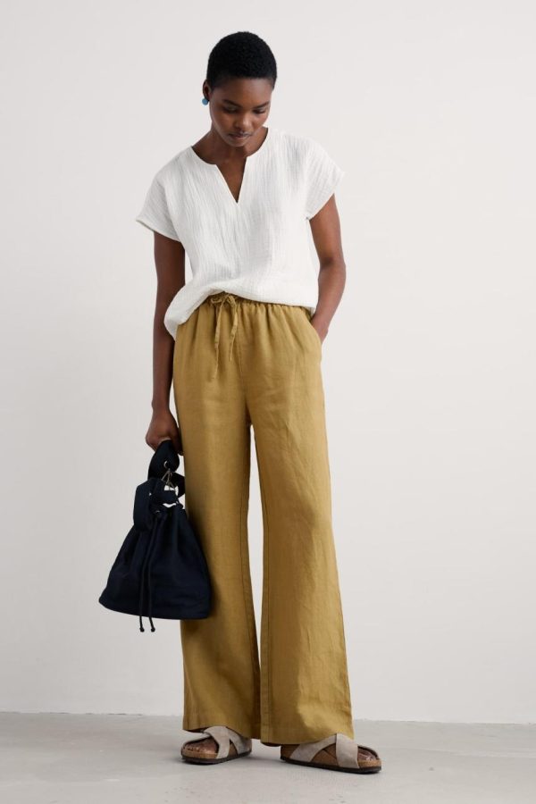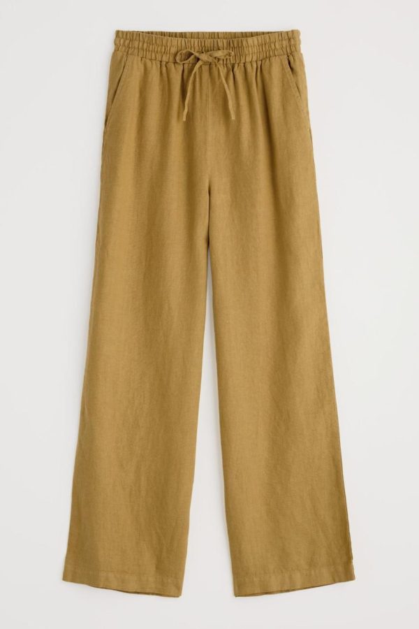 Wide leg linen trousers with an elasticated waist and tie fastening. We love how easy these are to dress up and down, and they’ve been garment-dyed for soft colour which should develop more character with every summer.