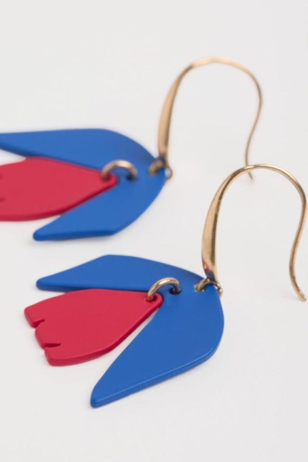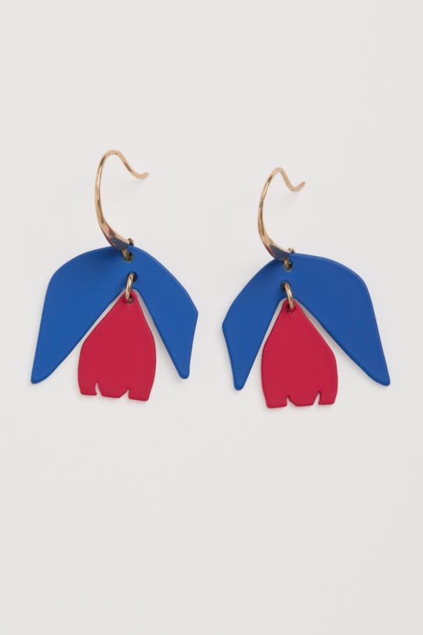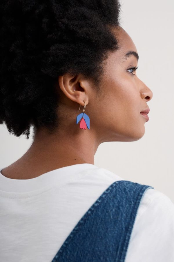 Bright and beautiful, these contemporary-style drop earrings are inspired by our own floral prints. The recycled brass is coated with smooth resin in eye-catching colours, complemented by the gleaming gold tones of the fastening. The petals are held together with rings, and sway gently when when you move.
